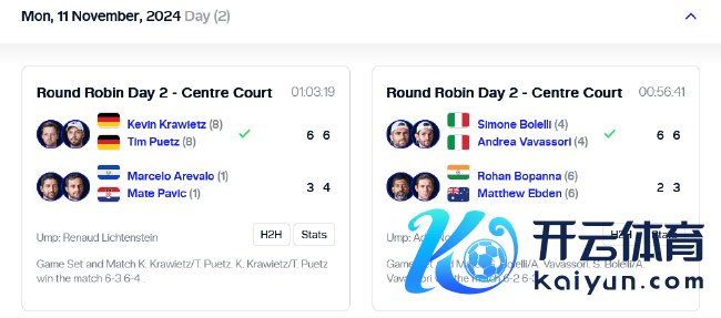 而原土作战的4号种子伯莱里/瓦瓦索里展现出高大竞争力,仅用时56分钟,就直落两盘,以6-2/6-3打败6号种子波帕纳/埃布登,获得本次总决赛的开门红。
