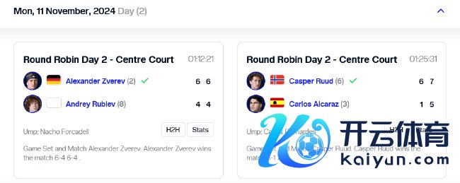 北京本事11月12日凌晨世界杯体育信息,2024ATP年终总决赛第二日战罢。在男单纽康比组首轮中,6号种子鲁德2-0驯顺3号种子阿尔卡拉斯,2号种子兹维列夫相通2-0横扫8号种子卢布列夫。
