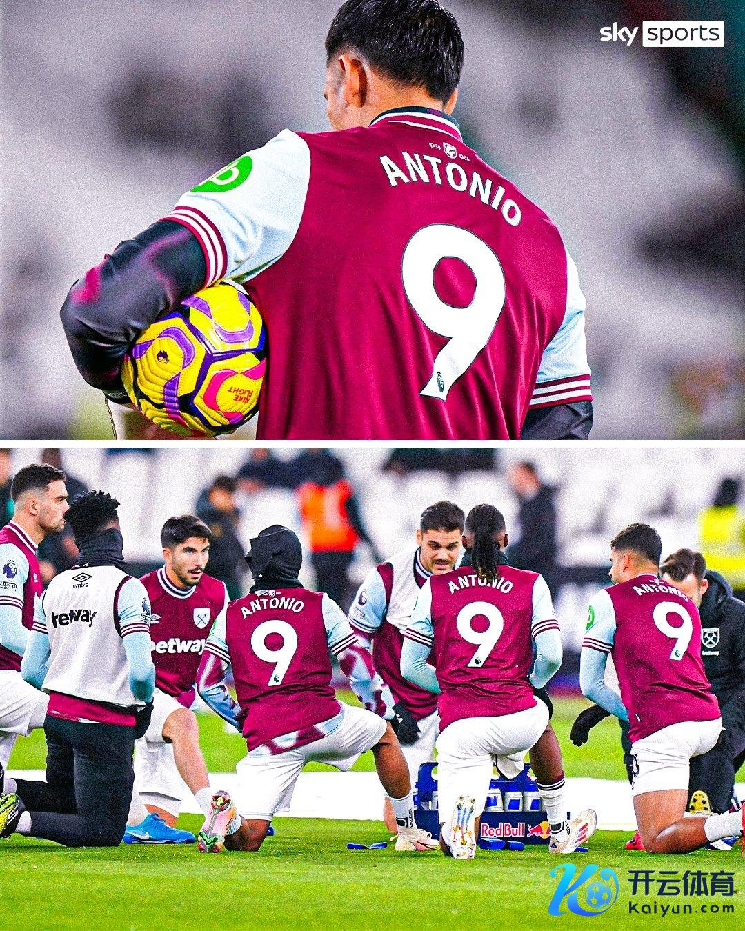 直播吧12月10日讯 英超第15轮,主场对阵狼队。赛前,西汉姆全队穿安东尼奥9号热身。