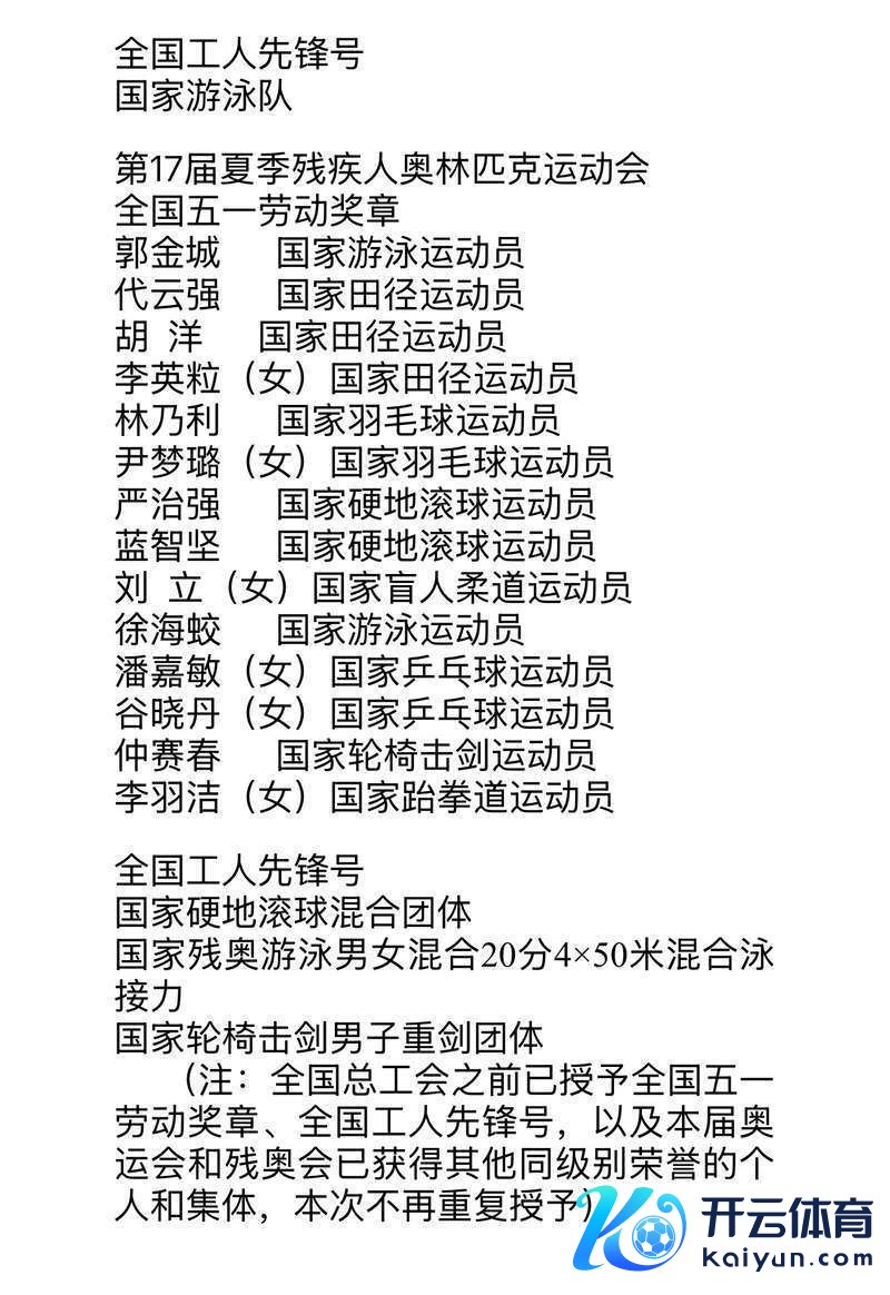 中华宇宙总工会同期对在第17届夏令残疾东谈主奥林匹克清爽会上赢得金牌的郭金城等14名清爽员授予宇宙五一服务奖章、国度硬地滚球搀杂团体等3支清爽队授予宇宙工东谈主时尚号。