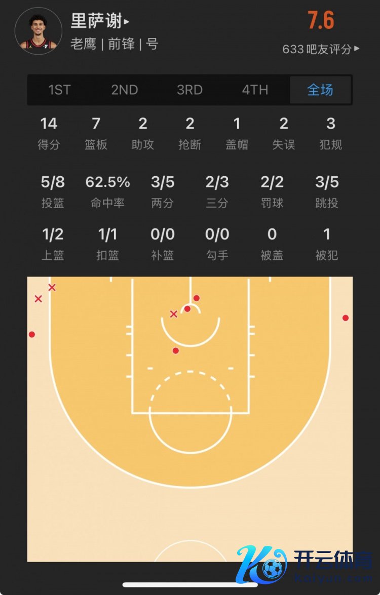 老鹰状元秀 扎卡里-里萨谢 登场26.7分钟