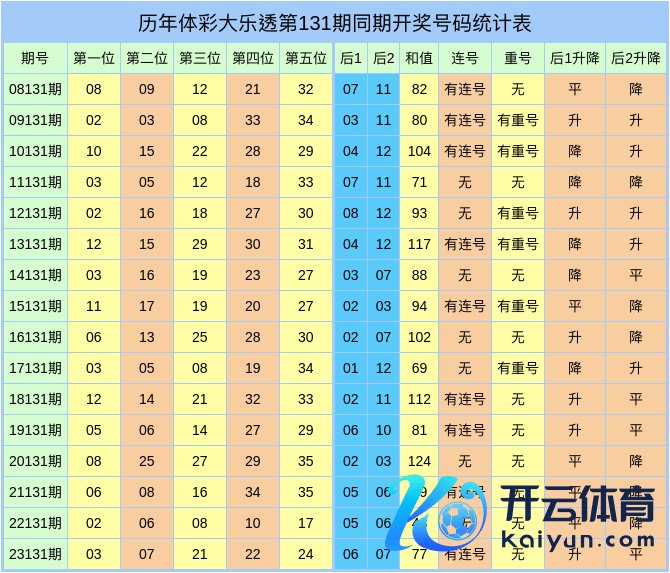 和值分析:在历史同时开奖中,前区和值出现边界在43-124之间,区间内的最大波动差值为81,其中大数和值与极少和值开出频次至极,各出现8次,现时极少和值开出了8年,本年同时瞻望和值不竭走小。